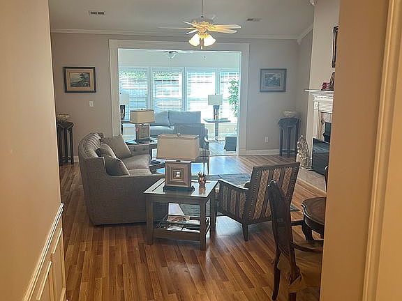 Step into this spacious home featuring an open-concept great room with soaring cathedral ceilings, a cozy gas-log fireplace, ceiling fan, and elegant wood flooring throughout. The finished, heated sunroom—with abundant windows—floods the space with natural light and offers direct access to a private patio, perfect for relaxing or entertaining.