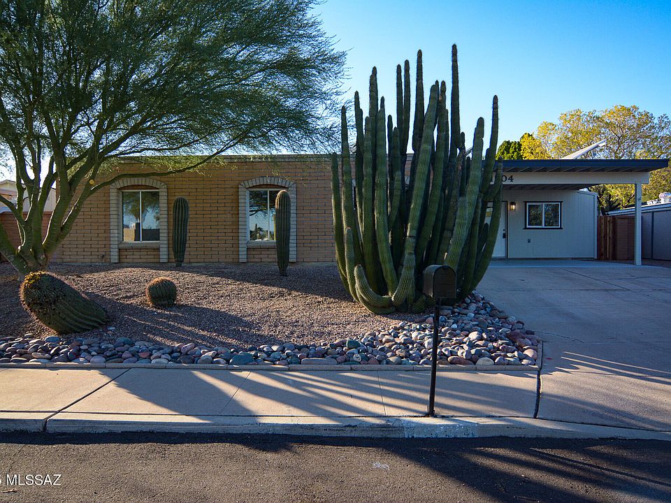 Beautifully remodeled Ranch style home. Located in a convenient East Tucson location. Charming block construction. Rich wood look LVP flooring. New carpet and padding in bedrooms. Updated kitchen with stainless steel appliances. New custom interior and exterior paint. Updated bathrooms. Forth bedroom can be used as a guest suite with own kitchenette and bathroom. Large fenced yard with sparking pool. Mature trees. Upgraded door hardware and light fixtures. Owned solar panels. Two car carport. No HOA. This home shows beautifully.