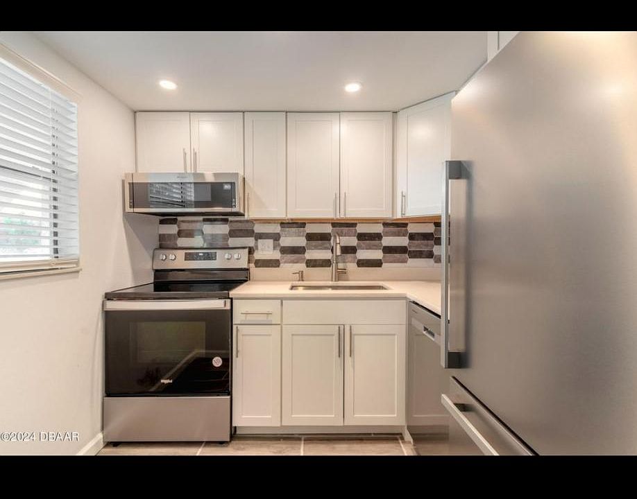 New window blindsPool viewNew kitchen quartz countertopNew tile floorNew stainless steel appliances