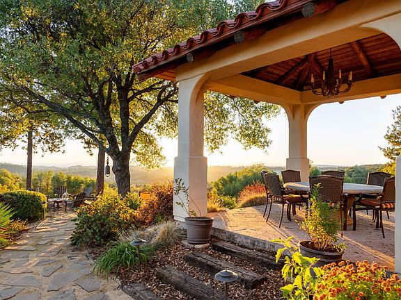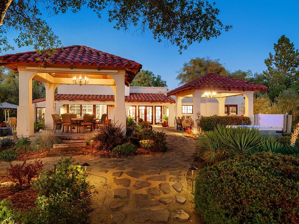Welcome Home to Hacienda Russ. Set on twenty-three rolling acres in the heart of Shenandoah Valley Wine Country, this Spanish-inspired estate captures panoramic foothill views, golden sunsets, and the timeless beauty of wine-country living. The single-level main residence offers two primary suites, a guest suite with fireplace, and a bright sunroom/office overlooking the hills. The remodeled kitchen showcases quartzite counters, custom cabinetry, and a professional range. A detached one-bedroom Casita with its own full bathroom adds flexible living with a covered porch and scenic views, bringing the property's combined improved living spaces to approximately 2,700 sq. ft. Outdoor living unfolds across patios, gazebos, and a spa beneath starlit skies, anchored by a granite outdoor kitchen and gardens made for entertaining. A 35x50 American Steel workshop, 30-panel solar array, and 20 kW generator ensure efficiency and reliability. Cross-fenced pastures, a barn, and usable acreage ideal for horses or small livestock complete this serene foothill sanctuary.