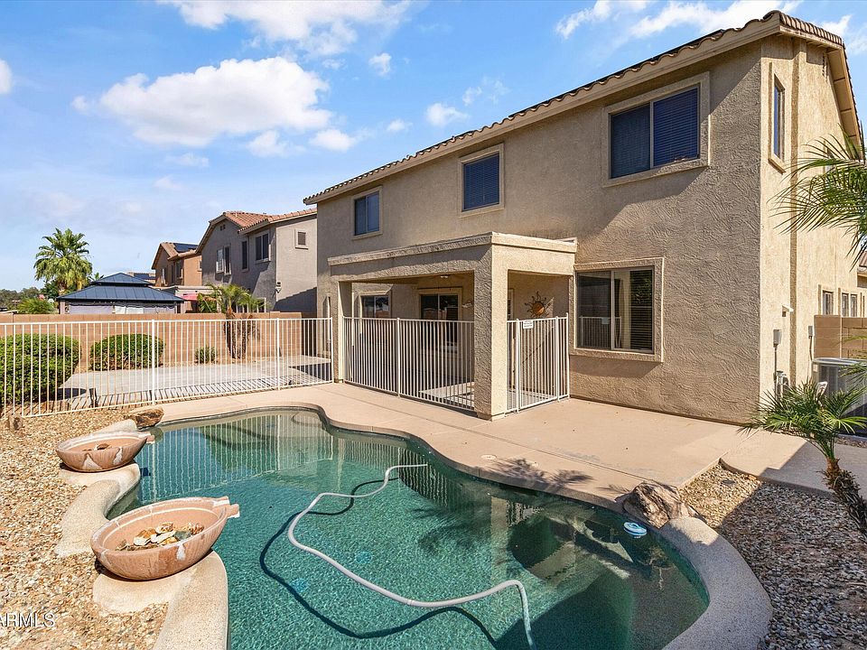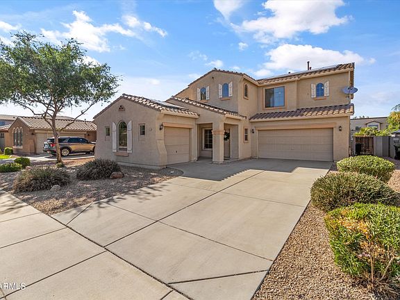 Welcome to this beautiful 4-bedroom, 2.5-bath home perfectly situated in a prime Surprise location—just minutes from top-rated schools, shopping, dining, and more. Step inside to soaring ceilings and an open, airy floor plan featuring tile throughout the main level and plush, newer carpet upstairs. The oversized family room seamlessly flows into a spacious kitchen complete with stainless steel appliances and a gas range—ideal for entertaining or everyday living. A versatile downstairs den/office provides the perfect work-from-home setup or bonus space. Upstairs, unwind in the generously sized primary suite along with three additional bedrooms, offering comfort and flexibility for the whole household. Out back, enjoy your own private oasis—this backyard is made for AZ living. Lounge by the sparkling pool, relax under the covered patio, or gather in one of several cozy seating areas surrounded by low-maintenance desert landscaping.