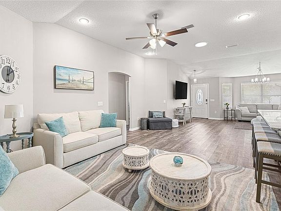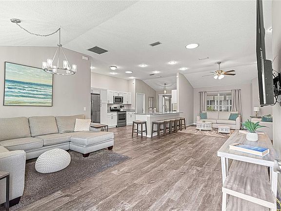 TURNKEY!! Discover the perfect blend of UNIQUE DESIGN, COMFORT and MODERN AMENITIES in this one of a kind Designer located in the VILLAGE OF SANTO DOMINGO! Enjoy charming curb appeal highlighted by a NEW ROOF (2021), neat landscaping and a CONCRETE BLOCK & STUCCO exterior. The interior has been COMPLETELY REMODELED and is highlighted by a large, modern kitchen with updated appliances, and granite counters. This home features a light and airy open floor plan and is the perfect place to entertain! There are NO CARPETS in the house and the lvp flooring is professionally installed throughout the entire home. The Master bedroom has an updated ensuite bathroom with double sinks and a tile walk-in shower. This is a split floor plan with the two guest bedrooms, guest bathroom and large linen closet on the opposite side of the home. The laundry room is located off of the kitchen and comes complete with a washer and dryer and cabinets. An added bonus is the ENCLOSED, TILED LANAI! This home is in a great location with two executive golf courses down the street and the Tierra del Sol and Hacienda Championship golf courses less than a mile away. Spanish Springs and 441 are minutes away, offering shopping, restaurants and entertainment. Additionally, the golf cart is available for purchase separately. Grab your "slice of paradise" before it is too late! Call today!