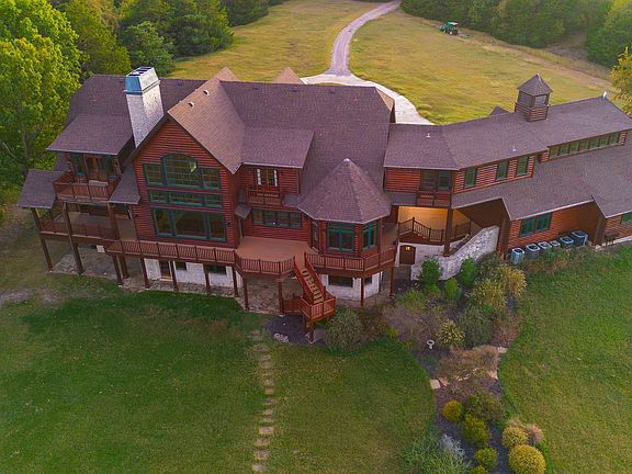 Soaring two-story stone fireplaceGrand entrywayMassive window wallsCircle drivewayExpansive wrap-around balconyCustom built-insPanoramic country views
