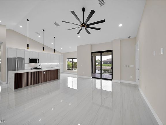 This 4-bedroom, 2-bath home offers approximately 1,800 sq ft under air with an open-concept layout. It includes impact-rated windows and doors, a 3-car garage, and a metal roof with a 50-year warranty. Inside, tile flooring runs throughout the entire home, enhancing durability and ease of maintenance. The kitchen features a waterfall quartz island and wood backsplash, complemented by high-quality cabinetry in both the kitchen and closets. The home is equipped with a whole-house reverse osmosis system, ensuring purified water at every faucet. The large sliding doors are pocket-style, creating a seamless transition between indoor and outdoor living spaces. Situated on a freshwater canal and outside any flood zone, this property offers both tranquility and convenience. Additionally, the seller is offering $10,000 toward closing costs and provides a 2-10 home warranty for added peace of mind.