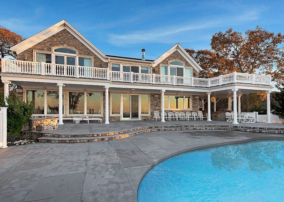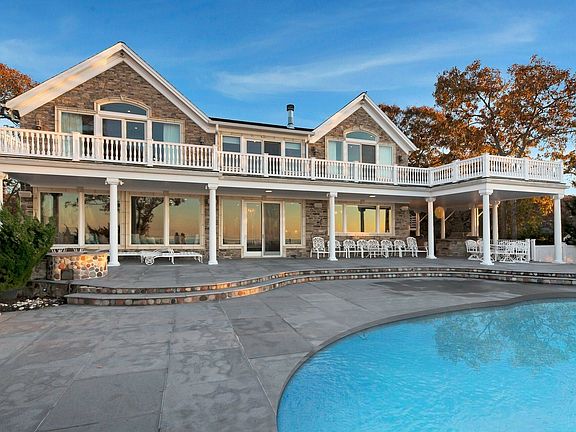 Extraordinary waterfront oasis with saltwater pool & private dock. Elevated on an exclusive estate setting stands this ultra-luxurious custom built waterfront residence with sweeping water views of the sound. This 6,000 square foot home, built with precision & superb quality designer finishes, offers distinguished amenities for relaxing or entertaining, including a soft modern interior with plenty of light, large windows & glass doors showcasing panoramic water views throughout. The great room with three sided glass lineal fireplace opens to the stone patio & the waterside heated pool & outdoor fire pit. Expansive second level balconies provide clear views across to CT & daily mesmerizing sunsets. Additional amenities include a playroom, home automation with premium audio equipment, outdoor bacci court & gas gourmet kitchen. This home boasts exquisite landscaping with native landscapes near the water & private dock. The ultimate in privacy and relaxed luxury in a premiere location!