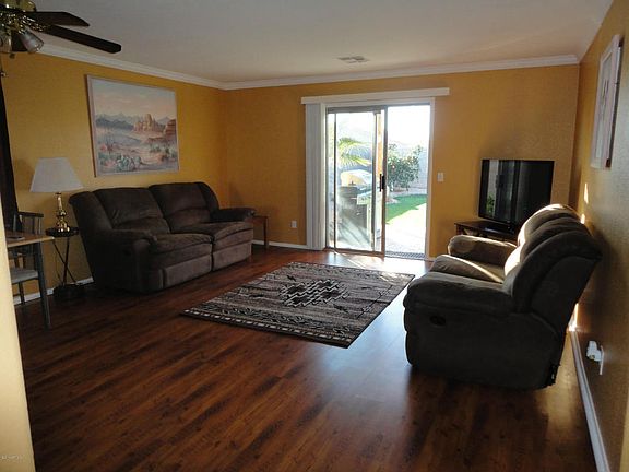 WOW! THIS IS AN AMAZING IMMACULATE HOME. PERFECT FOR 1ST TIME HOME BUYER, WINTOR VISITOR OR INVESTMENT. 2 BEDROOM, 1 FULL BATH WITH A 2 CAR GARAGE WITH WORK BENCH. LIGHT AND BRIGHT GREAT ROOM FLOORPLAN HAS OPEN AIRY FEELING WITH NEW CUSTOM PAINT, CROWN MOLDING, ALL NEW CARPET AND PAD, CERAMIC TILE IN KITCHEN AND LAMINATE WOOD FLOORING. AIR CONDITIONER 2 YEARS OLD. CEILING FANS. BACKYARD IS BEAUTIFUL AND FULLY LANDSCAPED WITH PAVER COVERED PATIO, FRUIT TREES, MATURE LANDSCAPING AND GREEN LUSH GRASS WITH WATERING SYSTEM IN BACK. VERY PRIVATE NO TWO STORIES BEHIND OR BESIDE HOME. DUAL PANE WINDOWS. THIS IS NOT A FLIP. tHIS HOME HAS BEEN MAINTAINED TO PERFECTION. JUST MOVE IN AND HANG YOUR CLOTHES. RFRIGERATOR TO CONVEY WITH THE HOME. SPECIAL SHOW INSTRUCTIONS!!