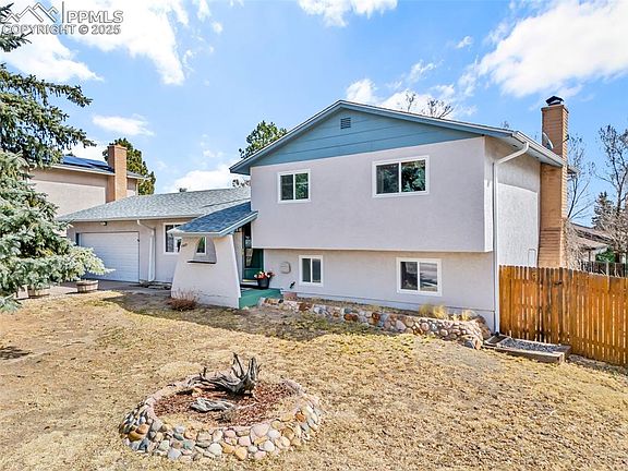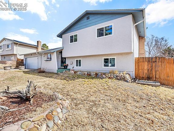New listing! Great home with great value. Come see this 4 bed, 3 bath, and 2 car oversized attached garage with new garage door. Situated on a large enclosed corner lot with fenced rear yard, dog run and spacious front for your landscape ideas. Wood burning fireplace in lower level, next to bedroom, bathroom and laundry area. Master bedroom is upstairs with adjoining 3/4 bath. Two more bedrooms and a bath are also upstairs. The built in counter/nook extending from the kitchen connects a warm and welcoming additional dining area with access to rear yard, also great for more seating, office setup, workout room or homeschool instruction. Conveniently located close to retail businesses and restaurants along the Powers Corridor. Minutes from COS airport, military bases and St Francis hospital. Located near Peterson Space Force base. This versatile floorplan awaits your viewing and offer. Easy to show. Recent upgrades include: 40 year compostion roof in 2023, Reflective Insulation Radiant Barrier throughout the attic, interior paint, gutters, new toilets, faucets, backsplash, ceiling fans & new lighting throughout. Washer & dryer and appliances included. New garbage disposal. Outdoor valves recently replaced with new self draining faucets.