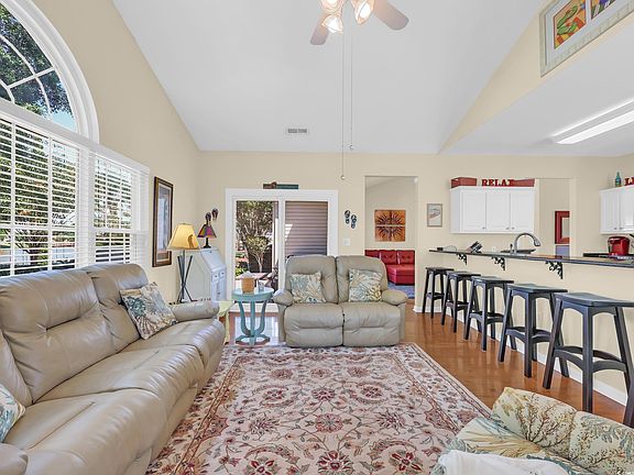 Best Value on the water, single level comfort and just 3 miles to the beach! New HVAC in 2023. This 3-bedroom, 2.5-bath beauty offers charm, space, and convenience. Family room, living room, and primary suite all showcase water views. Vaulted ceilings throughout. Formal dining room, breakfast nook and extended breakfast bar. Kitchen boasts granite countertops, stainless steel appliances, ample cabinetry and a pantry. The primary suite features His & Hers closets, a dual sink vanity, shower and extra-long soaker tub. Outdoors, enjoy the serene back patio overlooking the pond, framed by mature landscaping. Extended driveway pad and attached two-car garage. Transferrable termite bond. Low HOA fee includes access to two community pools. Golf cart to Lowe’s, Walmart, Aldi, and dozens of restaurants. In under 15 minutes, you can be at Market Common, Myrtle Beach State Park, or Myrtle Beach International Airport. Convenient to medical centers, doctors’ offices, and pharmacies.