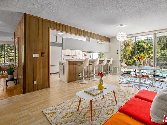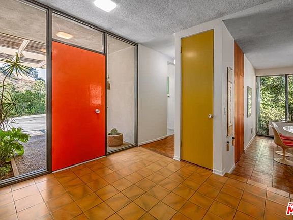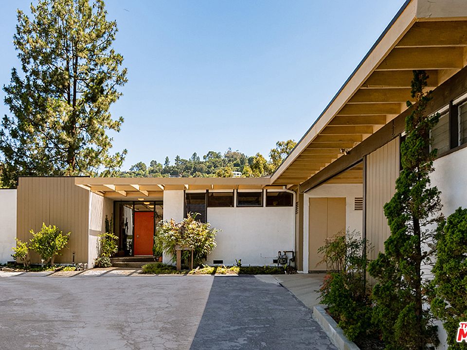 Welcome to this idyllic 1959 mid-century modern home in the hills of Sherman Oaks. Designed by architect Richard Kearney, the home has been in the same family since 1962. Secluded on a promontory up a private drive, this home is virtually untouched and features many original details - parquet floors, classic clerestory windows and a covered carport. Several rooms feature walls clad in rich exotic wood. The spacious step-down living room offers a tranquil setting looking out to lush vegetation, while soft light filters in through the windows. The stacked block fireplace and expansive open floor plan accent the space and make it a great spot for gathering or relaxing. Each bedroom has direct access to outside grounds. Original tile in the primary bathroom has subtle yet stylized decorative accents. The color block scheme on the doors throughout is thought to be original to the house. A glistening pool is set nicely on the property and allows for panoramic views of the surrounding canyon.