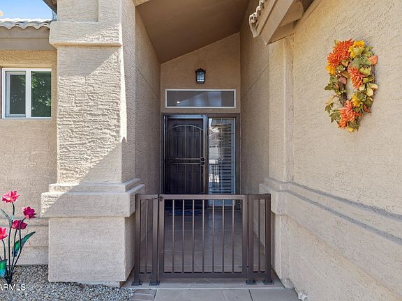 Relax in the serene backyard with tranquil water feature, raised flower beds, fruit trees, updated irrigation system (2019), & extended cool-decked patioperfect for entertaining or relaxing in the Arizona sunshine.