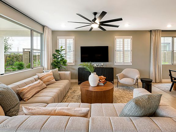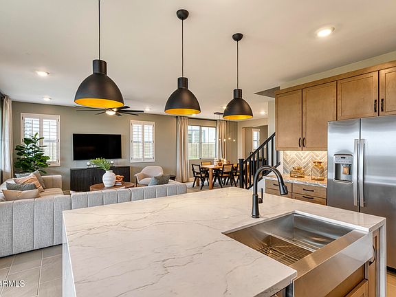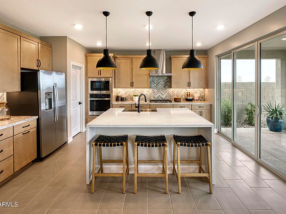 Immaculate, model home, located at Vireo at Waterston Central, featuring 5 bedrooms, a loft, an extended covered outdoor back patio, an attached 2-bay garage, and luxurious upgrades throughout! The Gourmet kitchen, a focal point in the home, includes a GE Profile 30'' built-in gas cooktop and stainless steel appliance package including a refrigerator, a 18'' recycle center, marble countertops with tile backsplash, a Delta touch faucet in matte black, and Diamond Signature Series Bryant Maple Buckskin cabinetry (also featured throughout the home). Other notable features include a 12' center pull slider at the kitchen, 12'' x 24'' wood look tile flooring, a washer and dryer in the laundry room, front and backyard landscaping with a private backyard, and more!