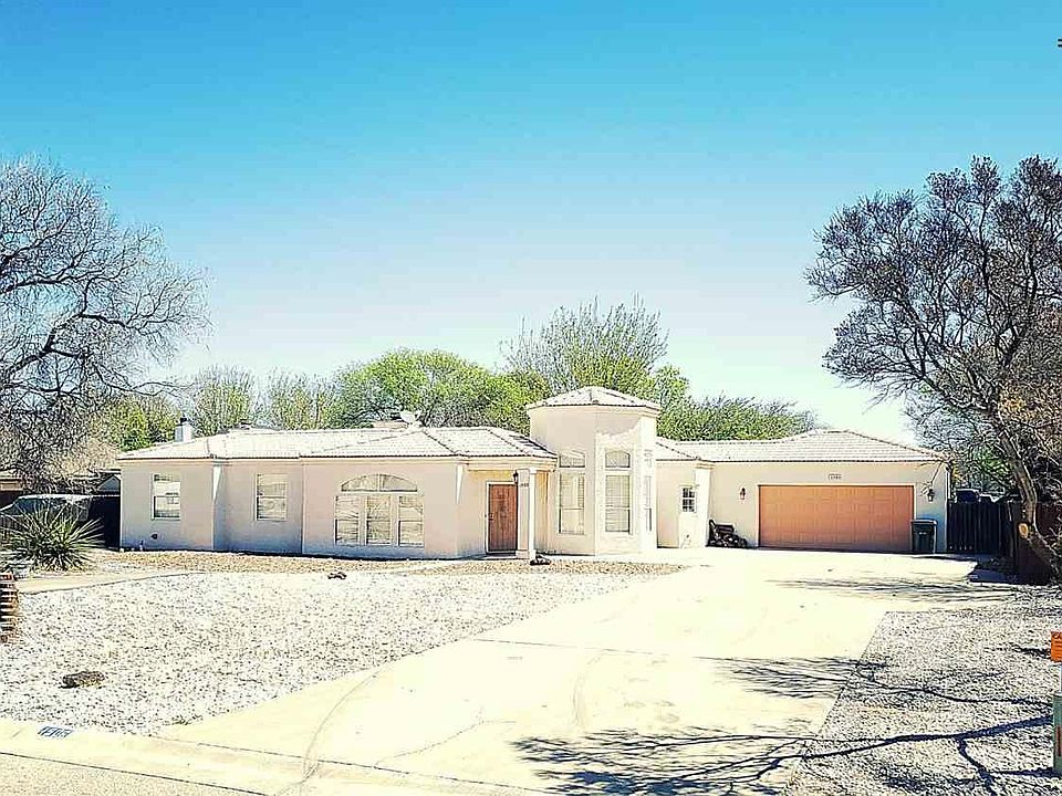 Enchanting 3 bedroom, 2 1/2 bath, 2 car garage home in La Huerta. Located at the end of a quiet cul de sac. The exterior immediately catches your eye with its beautiful tiled roof. Inside, the entry opens up to the tiled dining room with high vaulted ceilings and the spacious living room that features an impressive kiva fireplace. The cozy kitchen offers plenty of counter space and cabinets to tuck away appliances and supplies as well as a built in office area. There is also a flex area/room just off the kitchen. The laundry room his HUGE and has a convenient mud sink. There is plenty of privacy in the master suite. The master bedroom has access to the rear porch and hot tub. There is also a lovely fireplace in the master. The master bathroom is luxurious, with dual sinks a relaxing tub and a nice walk in closet. You will love the great back yard and tiled back patio. It has a solero covered patio that can be open or closed.