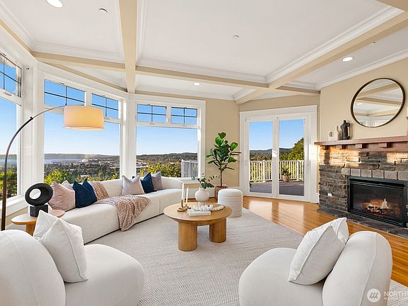 No filter needed for this sweeping view! Perched on Renton Hill, this exceptional home invites you into a world of sweeping 180° views—Lake Washington glimmers below, the Seattle skyline sparkles to the west, and mountains rise in the distance. Inside, natural light dances across new kitchen surfaces and freshly painted walls. The main-level primary suite offers a peaceful retreat, while the chef’s kitchen stirs inspiration with new granite slabs, skylights, and stainless appliances. Rich hardwoods flow to a grand view deck. Downstairs, new carpet cushions three bedrooms, two baths, walk-ins, a generous family room and outdoor covered porch. Designed by a celebrated Street of Dreams builder—this is more than a home; it’s a place to exhale.