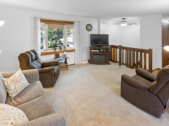Step inside to a spacious foyer with a large coat closet and cozy seating area. The upper level features a bright Kitchen with white enameled cabinets, solid surface countertops, updated fixtures, and stainless steel appliances—including a refrigerator, stove, and microwave (all new in 2023) and dishwasher (2021). Durable LVP flooring flows through the Kitchen, Dining room, and upstairs Bath, while the Living room boasts plush updated carpet and a large bay window that fills the space with natural light.