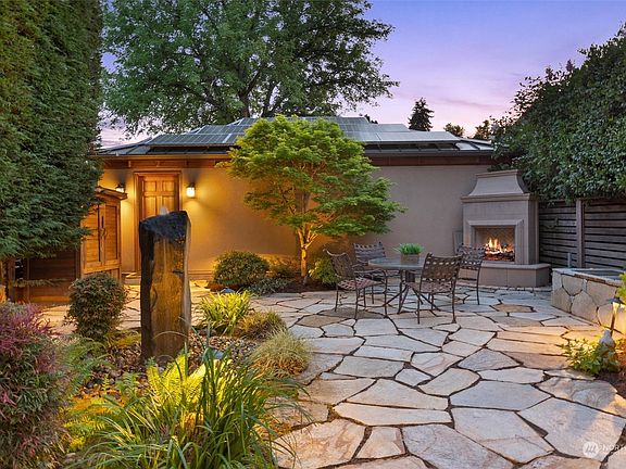 Contemporary Mediterranean meets eco-friendly in this extraordinary home. Enter to main level living room with floor to ceiling built-ins & gas fireplace. Open concept gourmet kitchen highlights warm wood, limestone slabs & stunning stainless appliances and opens to lush private courtyard garden with slate tile, water feature & outdoor fireplace. Upstairs master suite is an oasis with its spacious 5 piece bath, huge walk-in closet & French doors to balcony. Two additional upper level bedrooms, one appointed as an office with dual workspaces accentuated by rich wood paneling. Lower level bonus room/den with 4th bedroom, half bath & laundry. Solar panels adorn the roof of detached 2 car garage with vehicle charging station.