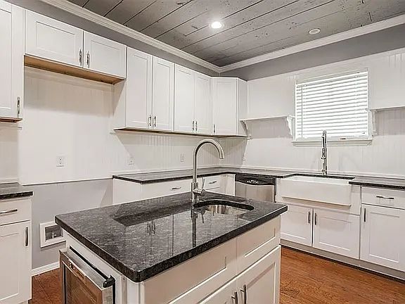 The kitchen boasts sleek, granite countertops, custom cabinetry, and stainless-steel appliances.