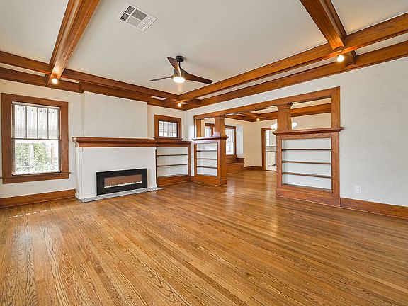 Welcome to this beautifully restored 3-bedroom, 2-bathroom bungalow. From the moment you arrive, the eye-catching lavender exterior and mint green door set a playful, welcoming tone. Inside, you'll be greeted by stunning original woodwork, coffered ceilings, and refinished hardwood floors that seamlessly blend 1920s charm with modern updates.