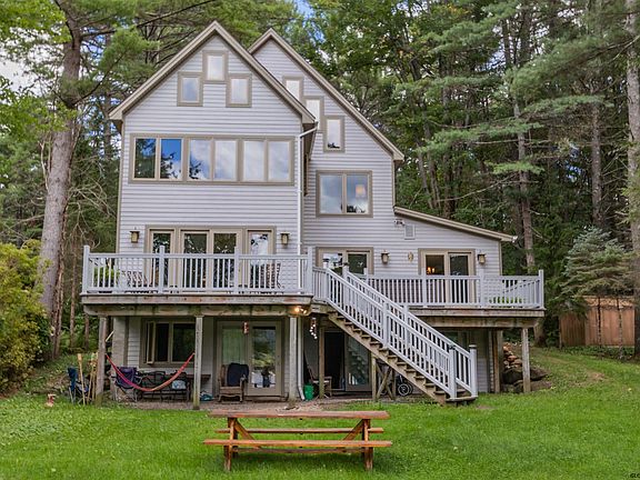 This is an incredible lakeside, waterfront year round house with 65' HRBRRD permit on Great Sacandaga Lake which is perfect for family & friend gatherings.The house boasts a large eat in kitchen w/ 2 ovens, 2 dishwashers & granite counter tops.The LR has a great view of the water & mountains & has hardwoood floors.The DR could be used as a first floor bedroom if needed.The master BR is spacious plus faces the lake w/great views.The 3rd level is finished & could be a dormitory for kids, an office or extra BR's.The walk out basement apt. consists of a K, LR, 2 BR's & bath.To store the toys there are 2 det. garages.The lg. garage has high ceilings & an upstairs for storage which is finished plus has a waterline that runs to it.Hot tub stays. Pre qual req.& Covid reg. to be followed.