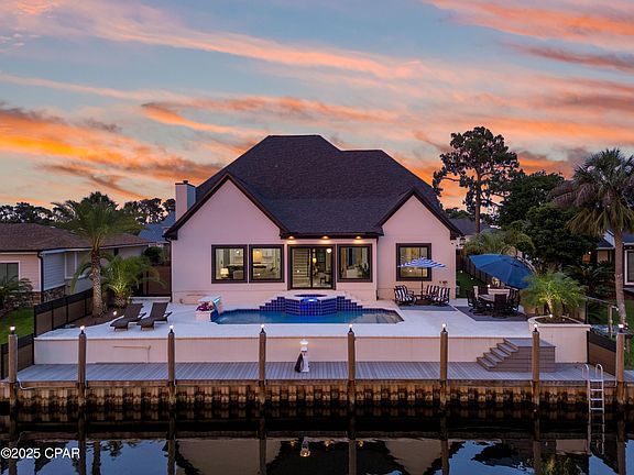 Private dockComposite deckingSaltwater pool and spaCanal-front estateWaterfall-edge quartz countersWide-plank white oak flooringLed-lit spillway