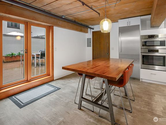 Perfect location to enjoy the best of the Seattle lifestyle while being a short distance from SLU! Located across the street from Pike Place Market, ferry terminal & the brand new waterfront park, this unit is surrounded by great restaurants, shopping & entertainment. Character abounds in the loft-style one-bedroom with exposed brick, stunning wood ceilings, old-growth beams, & wall-to-wall windows. Modern kitchen amenities including upgraded appliances: Fisher & Paykel induction cooktop, Bosch double oven/microwave & oversized fridge. Updated bath, spacious bedroom, extra-large closet, & in-unit washer/dryer. French doors lead to a huge patio with rare private outdoor living in the city. Storage unit, pet-friendly, & no rental cap!