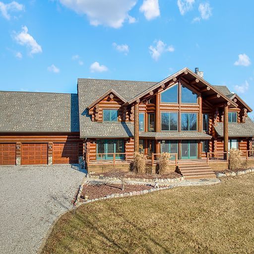 Home & Garden Country Estate in beautiful Manitou Beach. Over 4000 sq.ft. custom-built log home with 15" wall logs & 18" posts, trucked in from the Montanan forest, with an additional 2400 sq.ft. of potential living space. Built on natural field stone on foundation. 1500 sq. ft. of elevated wrap-around deck space, with all the views nature has to offer. Several barns, garages and sheds abound this MAGNIFICENT 80 acre serene compound. This park-like setting includes a spring-fed stocked fishing/swimming pond,pastures,walking trails,fenced-in garden & mini-orchard. Roughly 30 acres of a heavy wooded area. Just on the outskirts of public access Round & Devils lakes.Walk into the magnificent open space of the MASSIVE great rm. with it's 28 ft. vaulted ceilings. Southern facing floor-to-ceiling wall of Pella windows. Towering natural fieldstone wood burning fire place(set up for gas). Natural wood flooring through out this elegant home. Open gourmet island kitchen boasts granite countertops, large bay window, oak mission style cabinetry, sub-zero fridge, island gas cooktop,ect... Main floor master suite includes doors to the massive deck overlooking the estate grounds. 10' ceilings, huge walk-in closet with custom built-in dressers. Master bath boasts a Kohler heated jacuzzi tub & a new custom shower. Front-of-the home library with built-in desk & floor-to-ceiling bookshelves. Upper level has a massive loft area(could be 5th bed rm.) Jack & Jill bathroom separate the two upper main bed rms. Each featuring a built-in elevated play loft. Large guest suite with reading nook & private bath. Huge 9' basement has been plumbed for bath and wet bar & has ample storage along with bonus rooms. This forever home is the work of the original owners, who are relocating. This home shows the vision,care and love that has been a work in progress for the last 25 yrs. No expense has been spared, with updates including a two yr.old hurricane/hail resistant roof,master shower,walk-in closet system,drivway,ect.