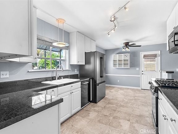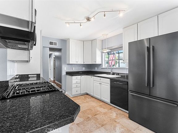 BEST VALUE IN THE AREA! Don't miss this move in ready home, tucked away in a hidden corner of Goldenwest Estates. This beautifully expanded and updated 3 bedroom 2.5 Bath home is just under 1700sqft. with a spacious Primary Bedroom and ample closet space complete with a private on-suite bathroom. French doors provide the room with your own gateway to the peaceful backyard with a spacious patio, beautiful no maintenance synthetic grass, and decorative stone planters. This private outdoor space is great for BBQ's or just taking some time to unwind and relax. The Family Room addition would make a great ADU candidate, with an easy transition to a private office, separate playroom or a in-law suite (half bath included). This space could easily remain as an additional entertaining area with gas fireplace which flows nicely into the dining area and cozy eat-in-kitchen. White kitchen cabinets are complimented with black granite counters and a new six burner gas range. The living spaces are fitted with a fabulous distressed hardwood. The extra large driveway has highly sought after potential for boat or RV parking.