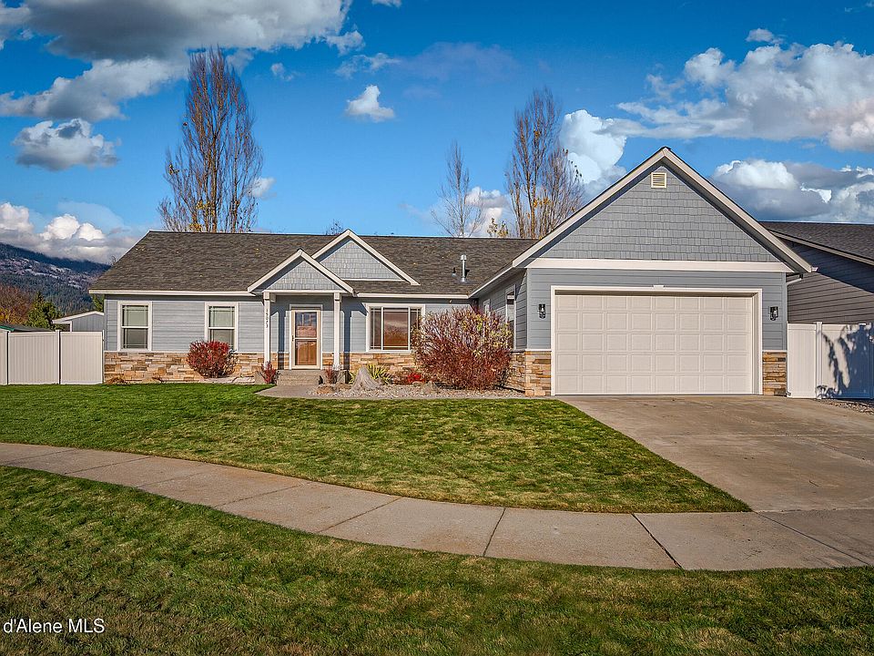 Discover single-level living in this well-cared-for 3 bedroom, 2 bathroom home offering approximately 1,800 sq ft on a fully fenced .18-acre lot. The layout is open and functional, featuring a spacious kitchen, a cozy wood stove, an attached 2-car garage, and an 8x16 backyard shed for additional storage. This home has received thoughtful updates throughout. Recent improvements include fresh interior and exterior paint, new sod, repaired fencing, and a newly painted garage floor. Inside, the kitchen shines with brand-new appliances and professionally cleaned and sealed marble countertops. Flooring has been refreshed with new LVP in the dining area, cleaned bamboo and tile surfaces, and new carpet in the walk-in closet. Additional upgrades include new security screen doors, updated light fixtures, a new attic fan, and newly installed exterior lighting with a timer. Major systems have been serviced for peace of mind: the wood stove was cleaned, the HVAC received a new filter, the ducts were professionally cleaned, and the electrical system was inspected by two electricians. The sprinkler system has been checked and blown out for winter, and the conditioned crawl space is designed to support a cleaner, drier environment. Located just minutes from Rathdrum Mountain's 550 acres of public recreation, this home offers easy access to trails, views, and year-round outdoor enjoyment. Nearby amenities include Majestic Park with its seasonal splash pad, local restaurants, medical services, schools, and a growing network of walking and biking paths. The neighborhood offers a comfortable atmosphere with well-kept homes and convenient access to everything Rathdrum has to offer. Warm, move-in ready, and surrounded by North Idaho's natural beautythis home is a wonderful opportunity to settle into the heart of Rathdrum.