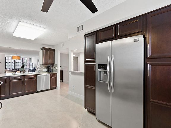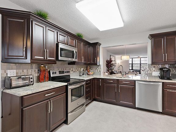 Beautiful remodeled kitchen with Frigidaire stainless steel appliances, granite counter tops and soft close cabinets. Over size laundry room with storage space. Split bedroom floor plan. Upgraded bathrooms. Extended living area. Ceramic tile throughout. Beautiful view of the lake. Hurricane impact windows. HWH 2014. Newer W/D.