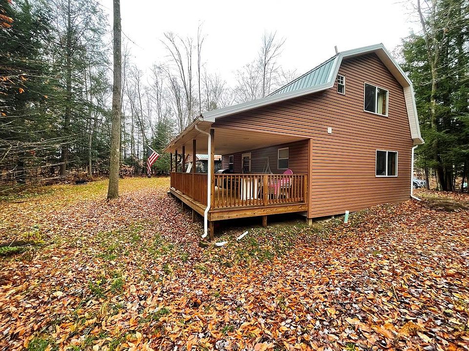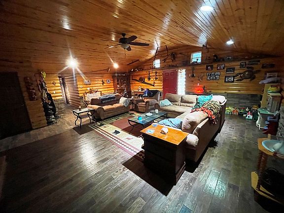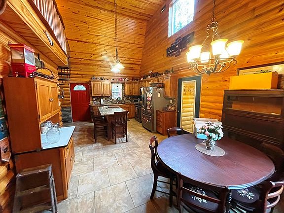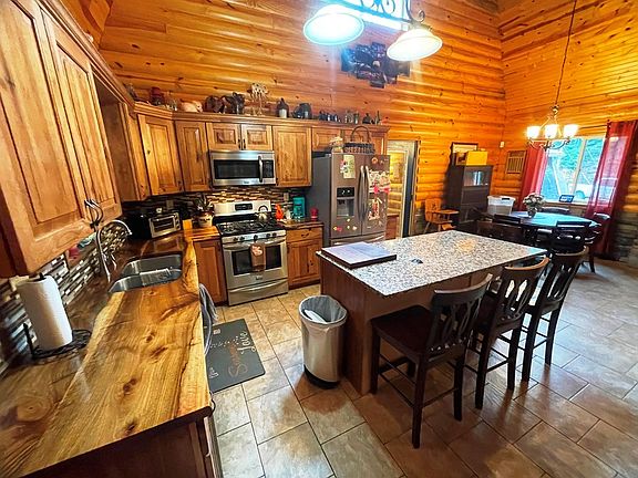 House extraordinaire! Nestled off roadway on 5+ acres. Log cabin interior/ concrete exterior, 2- car garage, 2 bed/ 3 baths, first floor laundry, open concept. Custom kitchen w Walnut countertop. Tile & hardwood floors throughout. Attached 2 car garage is 26'x36' with access to the crawl space (a must see). Year- round living or setup as a lodge! Features an 12' x 26' covered patio. Don't let this unique house slip past your fingers.
