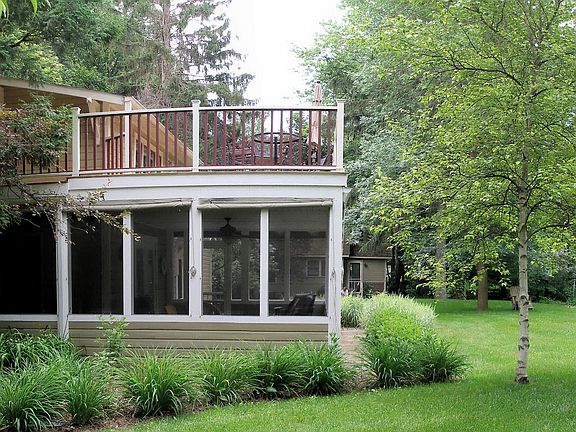 The larger house has a spacious three sided screened-in porch with garden views and a second floor large open-air deck with garden and seasonal lake views.