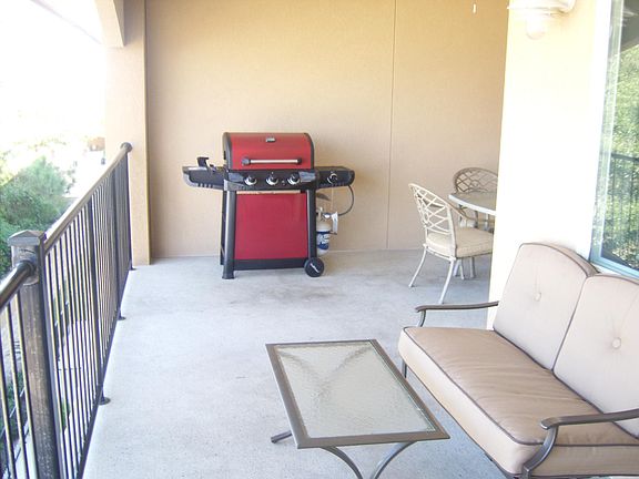 There is a 500 square foot covered balcony that overlooks the pool. It has outdoor furniture and a grill.