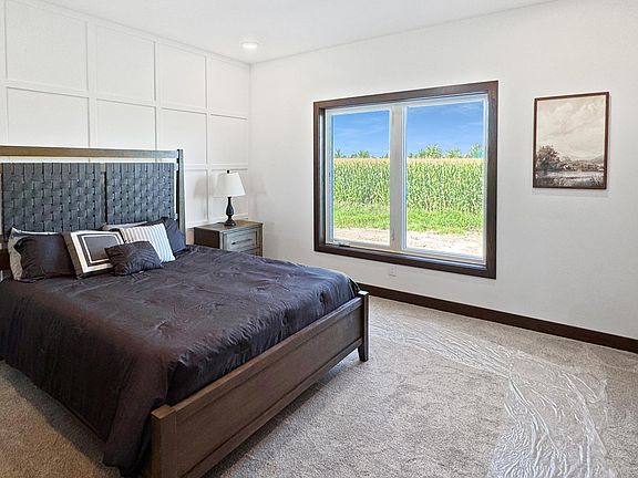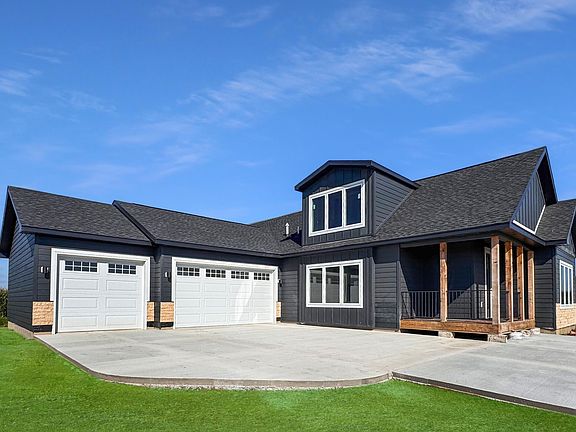The exterior features LP Smartside siding in Midnight Shadow, complemented by wide trim in Snowscape White, creates a welcoming contrast. Architectural shingles in a sleek charcoal hue, paired with low-maintenance black soffits and fascia, offer a timeless and clean look. The triple stall garage is your dream come true. An oversized gorgeous, custom-crafted front door invites you in, while the covered porch and maintenance-free composite decking are perfect for outdoor relaxation.