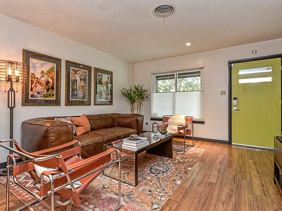 The house is perfectly situated on a corner lot with massive curb appeal. The driveway was poured this year & allows for 6 cars. The custom steel planter with low-maintenance plants and cactus.