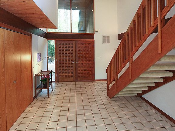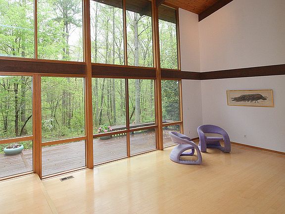 Sits way back off Jones Ferry on 5 beautiful peaceful acres to relax, garden & enjoy nature trails, backs up to 65 acres of conservation land. Fabulous house! Very open light-filled Deck house. Cedar clad cathedral ceilings, post & beam construction, mahogany trimmed windows & doors, maple hardwood floors, 2 story stone fireplace, gorgeous views throughout the house. Four bedrooms & 3 full baths. mature landscaping & deer fence. Newly painted inside & out. Great quality built house! Come take a look!