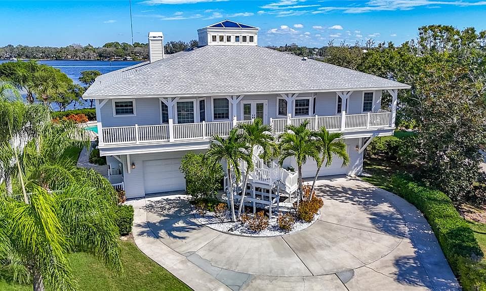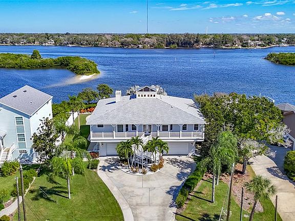 Discover a rare blend of coastal elegance, privacy, and modern design in this newly remodeled waterfront estate set on an elevated double lot along the scenic Anclote River. Built for both luxury living and resilience including a new roof in 2021, this home remained dry and undamaged through recent hurricanes, offering peace of mind and enduring value. Step inside to a bright, open-concept living area crowned by a lantern-style cupola that bathes the interior in natural light. Twelve-foot ceilings and expansive glass pocket doors create a seamless flow between indoor and outdoor living. The screened second-story veranda offers panoramic views of the tranquil cove and river—perfect for morning coffee or sunset gatherings by the cozy glass-front fireplace. The spacious chef’s kitchen is equipped with premium Café Series appliances, including an Induction Café Series cooktop and Advantium Café Series built-in ovens, along with a Sub-Zero refrigerator, farmhouse sink, and striking black granite countertops reminiscent of river rock that complement custom cabinetry. Retreat to the luxurious master suite upstairs, featuring an oversized his and hers closets and a fully remodeled spa-style bath with designer finishes. Downstairs, a private mother-in-law suite includes a full kitchen, making it ideal for guests or multigenerational living. The four-car garage provides ample storage for vehicles, water toys, and more, while an elevator offers effortless access to all levels. Step outside to enjoy lush tropical landscaping, a large paver sundeck, and a sparkling swimming pool overlooking the water. The new dock installed in 2021 features two lifts, fresh water and a fish cleaning station. Located just inside the mouth of the Anclote River, there is easy access to the Gulf, island beaches, and waterfront restaurants just minutes away. Whether entertaining or unwinding in your own sanctuary, this home offers the best of Florida waterfront living—light, space, privacy, and luxury in every detail. Additional upgrades include: new water heater 2023, reverse osmosis system with filter under kitchen Sink, and outdoor shed to convey.