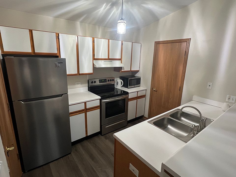 Peninsula breakfast barLarge open kitchenKitchen appliancesLots of cabinetsOwn parking spaceLots of storage spaceVaulted ceilings
