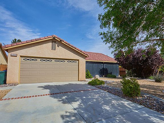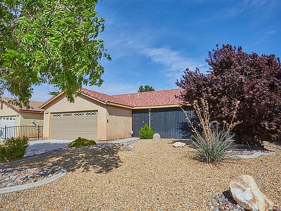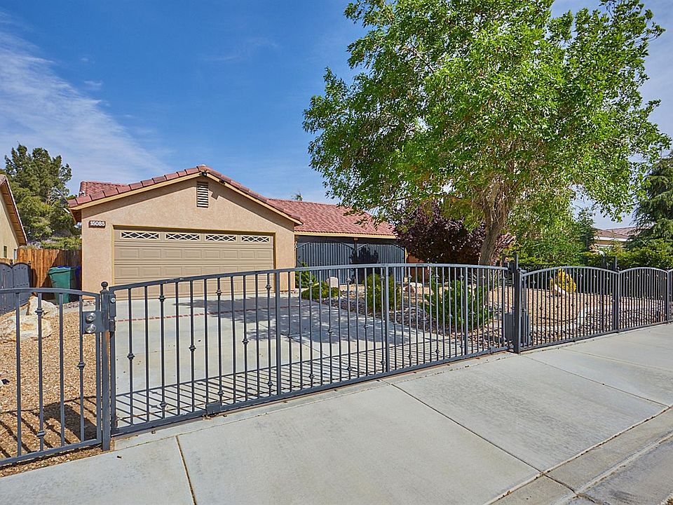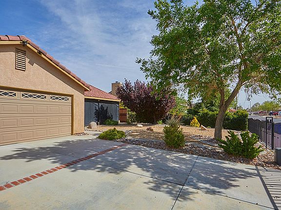 Beautiful home in Adelanto. Shows like a model home!! New vinyl water proof flooring, new interior paint. 1398 sf. 4 bedroom 2 bath with a family room and fireplace. Double garage with automatic door opener and storage cabinets. Tile roof. Kitchen with stove, dishwasher and refrigerator included. Master bedroom with walk=ion closet. Master bathroom with shower and tub. Beautiful wrought iron enclosed front porch for privacy. Front yard is landscaped and enclosed with wrought iron fence and electric gate. Back yard surrounded with wood fencing, covered patio with a new roof, storage shed, gazebo, and large area covered with pavers. Conveniently located near shopping and school.