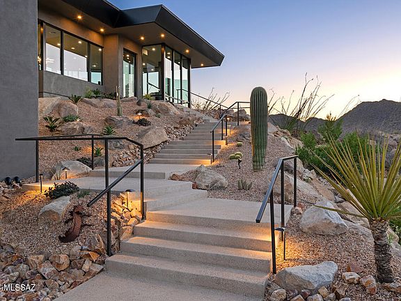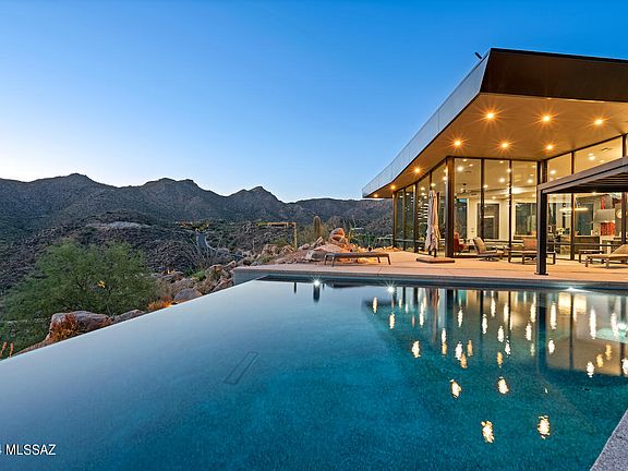 Come visit this custom Desert Modern residence within the man-gated community of Canyon Pass at Dove Mountain. Situated on a gentle rise above other neighboring homesites, this 9+ acre residence is positioned within large Sonoran Desert rock outcroppings providing unobstructed views in all directions. The 'open floor plan' was designed by Mark Soloway w/high ceilings + oversized floor to ceiling glass panes. The residence provides unlimited views yet creates a feeling of privacy and exceptional solitude. High end finishes throughout this custom masterpiece include Subzero/Wolf appliances, Lutron shades and comes fully furnished including a baby grand piano, artwork and electronic accessories. A stylish glass pneumatic elevator provides access to and from the lower level which contains a secluded office w/wonderful views. Lower level also hosts an oversized 4 car garage, along with a separate 'bonus/exercise room' with universal gym and workbench area which is uniquely air conditioned. The private yet entertaining outdoor living space is complimented by a negative edge Pebble Tec pool, a rooftop waterfall feature, shaded ramada areas, and a linear gas fire pit. Up the spiral staircase is a "skydeck' great for stargazing, bird watching & overall nature viewing. Offered fully furnished - this is a fabulous package for this extraordinary home. Call for private showing appointment.