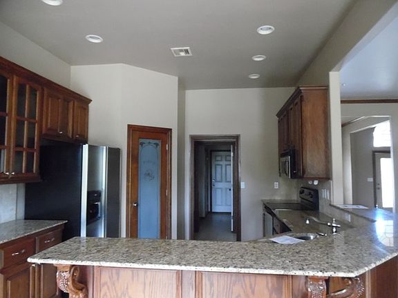 Exquisite design in this 3 bedroom 2 bath brick home with a 2 car garage with a circle drive. Entering the home you immediately notice the high ceilings and the gorgeous custom wood work. Office area with a closet and formal dining area adjacent to the entry. Large living room with fireplace and vaulted ceilings open to the spacious kitchen with granite countertops. Drop in kitchen stove, microwave with vent hood and stainless steel refrigerator. Nice pantry cozy breakfast nook overlooking the yard. Back door leads to small back patio and lovely back yard with awesome landscaping! A definite must see to appreciate! Large utility room with room for freezer. Room over garage is a bonus room, media room or playroom. Master bedroom with tiered ceiling. Large master bath with double vanities, garden tub and separate shower. Walk in closet with built-in chest. Water heater is gas, water softener, PEC electric, Center Point natural gas. Ada public schools. Restrictive Covenants available in t