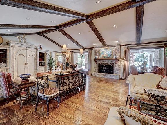Custom built in 1975 by Everett Dale. Big rooms & open floor plan with vaulted ceilings in kitchen & both living areas. Acres of oak floors. Large lot-just under an acre-circle drive in front, 3 car rear loading garage with an abundance of extra parking behind garage. Large entry leads to big living area with vaulted ceiling and wood fireplace. Very large for formal dining room. Updated kitchen with vaulted ceiling & eating area looking out to backyard with pool. Second living with wood fireplace and vaulted ceiling overlooking big backyard filled with trees and pool. Master on ground floor has his and her closets and spacious bath. Another bedroom on ground floor with its own bath. Upstairs are 3 beds and 2 full baths. Big concrete area behind garage would make a great basketball or pickle ball court. Light fixture over kitchen table, mirror in guest 1/2 bathroom adjacent to dining room are reserved. Buyer verify taxes- schools.