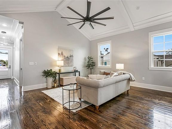 Simply gorgeous - beamed cathedral ceiling, crown molding, hardwood floors. Galley kitchen features stainless appliances including a wine cooler, pot filler, marble backsplash and extra tall shaker cabinets. Primary ensuite includes walk-in closets, his/ her vanities, walk-in shower and soaker tub. Large fenced yard with rear covered porch. Low homeowner's and flood insurance.