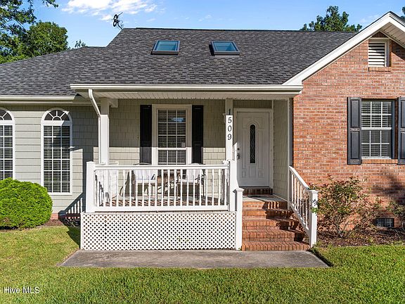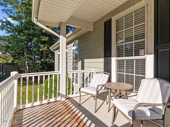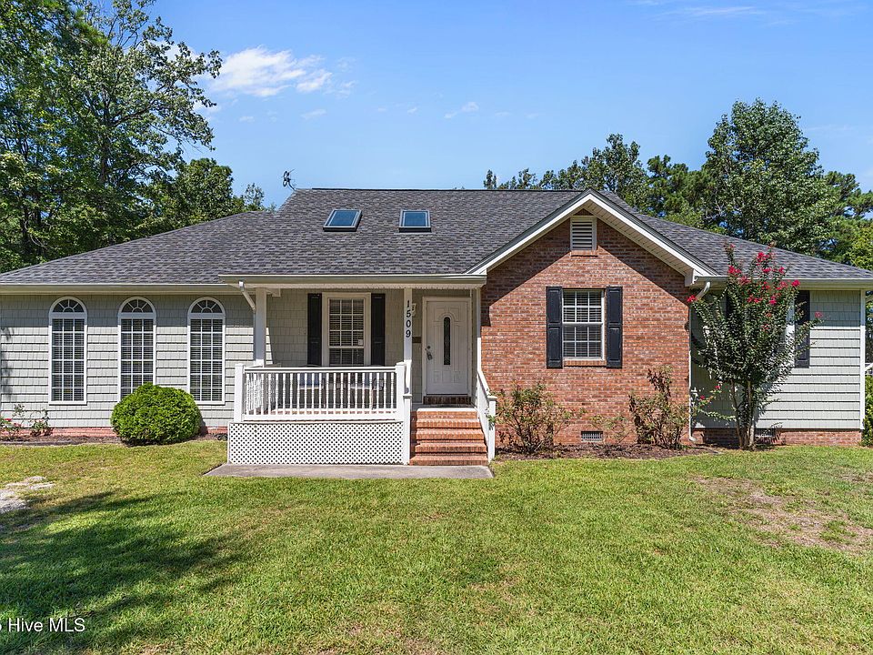 Nestled in a desirable coastal town just a short drive from area beaches, this inviting property offers the perfect blend of privacy, convenience, and charm. Ideally located between Wilmington and Camp Lejeune and within the sought-after Topsail school district, you'll enjoy easy access to local shopping, dining, and all the best the coast has to offer. Set on just under a half-acre lot and surrounded by mature trees, this home offers a peaceful, private setting. The fenced-in backyard includes a versatile shed with a garage-style door, ideal for storing outdoor gear or tools. A classic rocking chair front porch welcomes you in, perfect for relaxing with your morning coffee. Inside, the bright and airy living room features vaulted ceilings and skylights, creating an open, cheerful space. It flows seamlessly into a spacious sunken family room and a dining area with built-in cabinets and a sideboard. Sliding glass doors lead to a screened-in porch and a patio—perfect for entertaining or enjoying quiet evenings outdoors. The connected kitchen is both stylish and functional, with white cabinetry, granite countertops, and a tasteful tile backsplash. The primary bedroom offers dual closets and a private ensuite with a walk-in shower. Two additional bedrooms share a well-appointed full bath. The crawl space is encapsulated and has a dehumidifier. A new water softener was installed in 2024. The HVAC was replaced in 2017 and the roof was replaced in 2018. This property perfectly combines an unbeatable location with thoughtful features, making it an ideal place to call home.