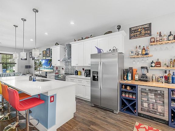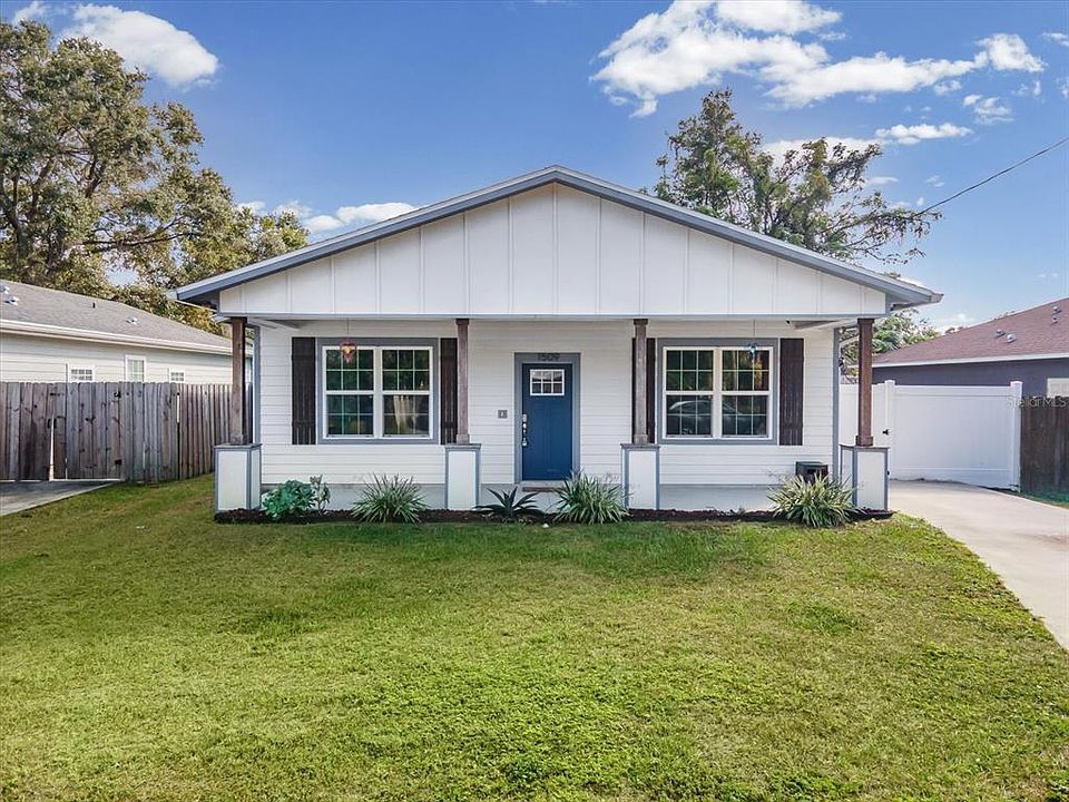 Welcome to 1509 E Caracas Street, a stunning 2021-built bungalow in Tampa’s highly desirable Seminole Heights neighborhood. Combining modern luxury with everyday comfort, this beautifully maintained home offers nearly 1,500 square feet of living space, featuring 3 bedrooms and 2 full baths. Step inside to an inviting open-concept layout where the great room, dining area, and gourmet kitchen flow seamlessly together—perfect for both entertaining and relaxed family living. The chef-inspired kitchen features 42-inch soft-close cabinets, cabinetry, quartz countertops, a designer tile backsplash, a large island with breakfast bar seating, upgraded stainless-steel appliances, a built-in wine bar with butcher-block counter, and a walk-in pantry. The spacious primary suite offers a private retreat with an en-suite bathroom featuring dual vanities, a walk-in shower, and a linen closet. Two additional bedrooms and a full guest bath offer flexible space for family, guests, or a home office. Enjoy the Florida lifestyle year-round with a covered front porch, a screened-in lanai with a ceiling fan, and a vinyl-fenced backyard for privacy and relaxation. Every detail of this home reflects thoughtful craftsmanship, including wood-trimmed windows and doors, hurricane-rated windows, Hardie Board siding, a leaf-filter gutter system with a lifetime warranty, an AC surge protector, a Tuff Shed for extra storage, and exterior motion-detection security cameras with cloud-based monitoring. Ideally located just minutes from downtown Tampa, Ybor City, Armature Works, Channelside, local parks, Tampa International Airport, top-rated universities, shopping, dining, and premier medical facilities—this home offers the perfect balance of sophistication, convenience, and Florida charm.