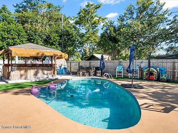 MOTIVATED OWNERS! Welcome to your own slice of paradise.. Step into the backyard oasis—your private escape featuring two stunning tiki huts, including one with a built-in grill and pizza oven. The newly installed pavers and pet-friendly turf create the ultimate space for entertaining or relaxing poolside. Additional features include a fire pit and outdoor shower, while the sparkling pool is complemented by a new filtration system, ensuring years of enjoyment. Inside, the home features wood laminate and tile flooring throughout and an updated kitchen with granite countertops and new refrigerator, microwave, and dishwasher. HVAC (2022) and water lines (2024) have been recently replaced. The home is topped with an energy-efficient metal roof, adding durability and long-term savings. Oversized 1 car garage and 2 sheds for extra storage. Minutes from shopping, dining, & more! This could be an awesome investment as a short or long term rental!