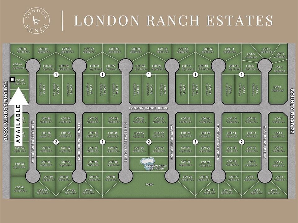 Introducing London Ranch Estates, London’s newest gated community, where serene views of untouched farmland provide the perfect backdrop for your dream estate. Nestled in the heart of London, this brand new neighborhood offers expansive homesites of at least half an acre, creating a unique opportunity to design and build a custom home that fits your vision. Designed for privacy, tranquility, and elegance, London Ranch Estates features 108 spacious homesites, each thoughtfully planned to offer a balance of seclusion and community. Residents will enjoy premium amenities, including: a luxury ranch-style gated entrance for enhanced security and sophistication, a resort-style community pool and lazy river for ultimate relaxation, a scenic pond perfect for outdoor enjoyment. With no restrictions on builders or timelines, you have the flexibility to select your preferred builder and architect and start construction when you’re ready. Ideally located just minutes from the highway, this prime location provides easy access to top-tier dining, shopping, and entertainment. Secure your luxury homesite today and experience the best of upscale country living! *Map is an artist’s rendering and may not reflect exact site features.