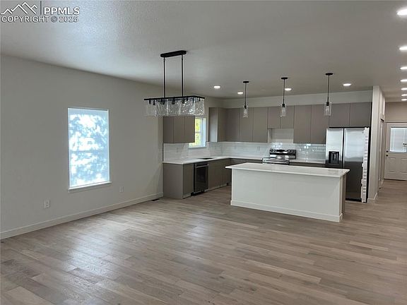 Looking for something new? Here is a custom home that is near completion, in a well-established neighborhood with no hoa. Designed with a craftsman style exterior and a modern interior, this incredible home offers true one level living. The kitchen is open in design and includes granite counter tops, a decorative tile back splash, LED can lighting, stainless steel appliances, under mount sink, a large functional island, a generously sized pantry, matte black hardware & light fixtures, and beautiful cabinets with quiet close doors and drawers. Gorgeous white oak, low maintenance, engineered flooring continues throughout a majority of the home. You will find high quality carpet and pet friendly pad in all the bedrooms. The living room is generously sized and will accommodate the largest of furniture. The primary bedroom has a private full bathroom with soaking tub and a spacious walk-in closet. From the back door there is a mud room that is steps away from the laundry room that will accommodate any size washer and dryer. Air Conditioning is included and will keep you cool during the hot summer days. The floor plan is well designed and includes 9' tall ceilings. Access to the furnace and water heater is on the main level, so keeping up with filter replacement is simple and easy. This home will be fenced with 6' cedar privacy fencing and front yard landscaping will be included. The concrete driveway will be over 50' long and you will be able to access the back yard with a swing gate, providing you a convenient place to store your toys. Enjoy some privacy as the home backs to mature trees and large 23 acre residential lot, or take some time to relax on the covered front porch. This home includes a brand new washer and dryer. You will be able to keep your cost of living low with no Hoa, no metro district, and low property taxes. Conveniently located just 6 minutes from Fort Carson and 4 minutes from shopping centers.