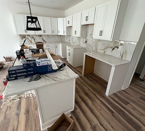 Large garageQuartz countersFenced in backyardLarge deep lotLarge tree lineVaulted ceilingsWhite shaker cabinets