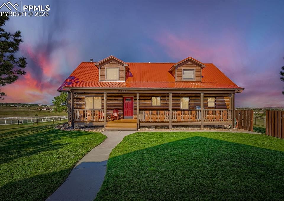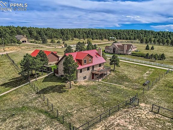 Welcome to this Hill Country–inspired gem in the heart of popular Black Forest! Situated on 5 beautiful acres with easy access to Colorado Springs and Denver, this charming two-story home with log siding, stone accents, and a durable metal roof offers over 3,700 sq. ft. of living space plus a full multigenerational setup. Inside, pride of ownership shows throughout. The inviting covered front porch opens into a bright and open-concept main level featuring a spacious kitchen, dining, and living area, plus a rare main-level bedroom and bath. The living room has a woodburning stove insert perfect for the chilly days to come. Upstairs you’ll find a vaulted primary suite with an en-suite bath and an additional private retreat perfect for an office, study, exercise, or flex room. The walkout lower level is a true bonus with a second family room anchored by a cozy wood-burning fireplace, three additional bedrooms, and two baths. One of the bedrooms offers an en-suite setup complete with a full kitchen and its own private entrance—perfect as a second family home or guest quarters. Outdoors, the property is as equally impressive. An oversized log-sided three-car detached garage complements the three-stall barn, tack room with electric, loafing shed, and multiple fenced pastures with water—perfect for horses or livestock. A paved concrete driveway, mountain and Pikes Peak views, and grassy meadows complete the picture, making this property a dream for hobby farmers, equestrians, or anyone seeking the best of country living with city conveniences.