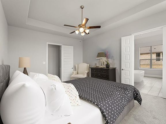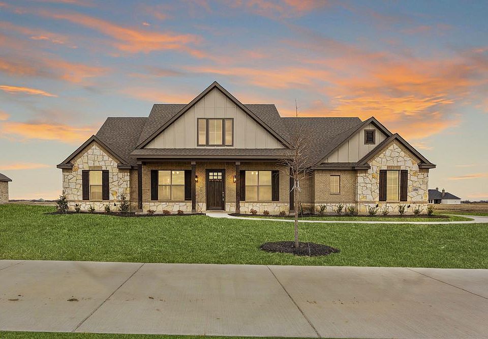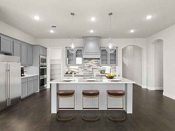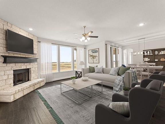 This stunning four-bedroom home with a warm stone-to-ceiling fireplace is perfect for modern family living. When you open the front door, a study with french doors welcomes you, which is a great place to work from home. The family room, kitchen, and nook all have beautiful wood floors, that will make family and friends fall in love with this home. The kitchen is large and well-equipped with a central island, and stainless steel appliances. The kitchen leads to the breakfast nook which features bay windows. The breakfast nook also has direct access to a large covered patio, the powder room, the utility room with a sink and cabinets, and the two-car garage. The master suite is set at the rear of the home in its own wing complete with an ensuite bath and a huge walk-in closet. Three bedrooms have easy access to a full bath and have their own walk-in closets.
