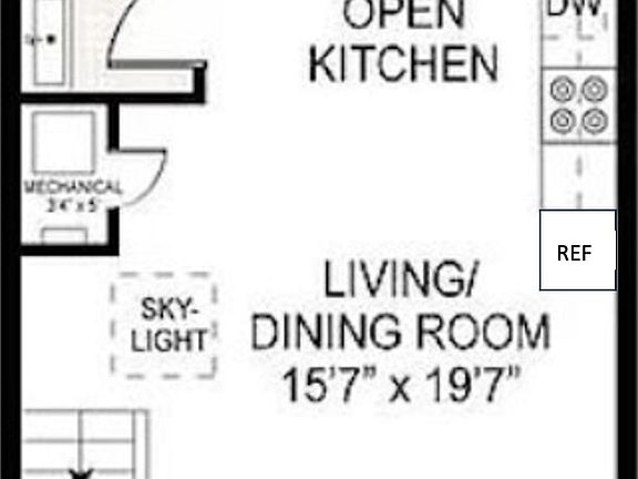 Sunlight fills the space from three north- and south-facing windows on either side, as well as a central skylight, creating an airy and uplifting atmosphere all day long. The open-concept living and dining area flows seamlessly into the sleek, contemporary kitchen, complete with stainless steel appliances including a dishwasher and microwave and generous cabinet storage.